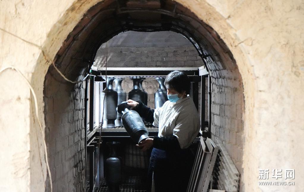 4月20日,在馆陶县陶艺漆艺研究所,一名工人检查出窑的黑陶。新华社记者 金皓原 摄
