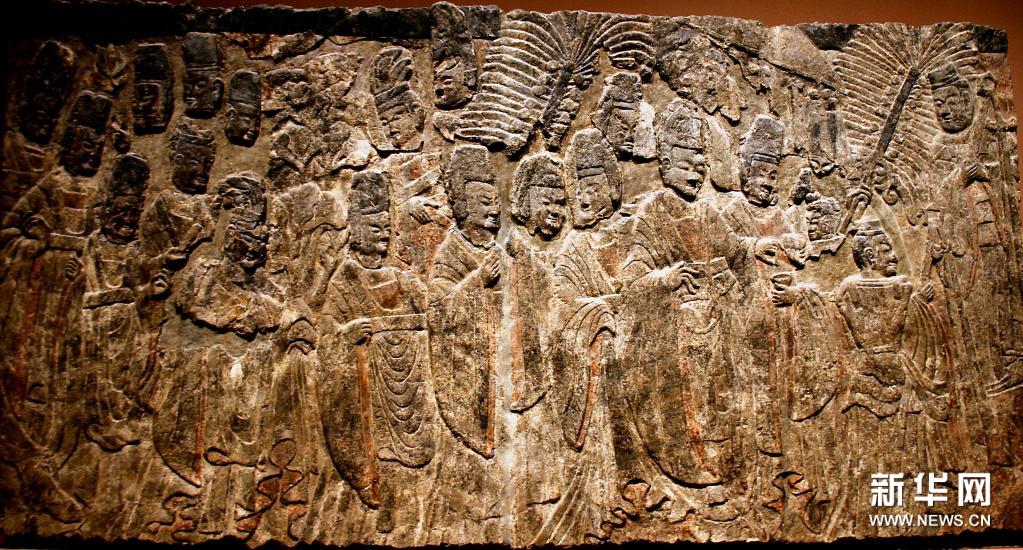 现收藏于纽约大都会艺术博物馆的《魏孝文帝礼佛图》(资料照片)。新华社发(龙门石窟研究院提供)