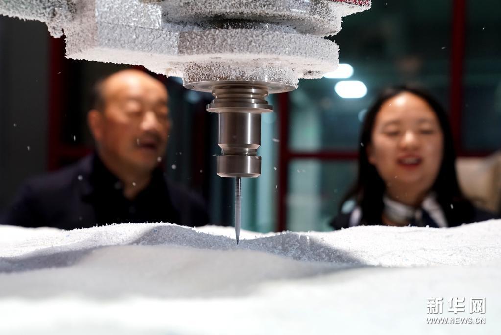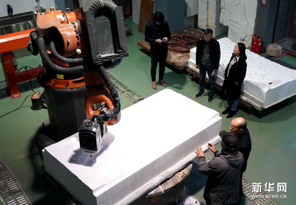 西安交通大学造型艺术研究中心的雕刻机器人在雕刻浮雕残壁实体模型(4月7日摄)。新华社记者 李安 摄