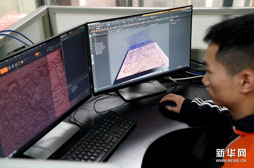 工作人员在计算机虚拟环境下对浮雕残壁进行数字处理(4月8日摄)。新华社记者 李安 摄