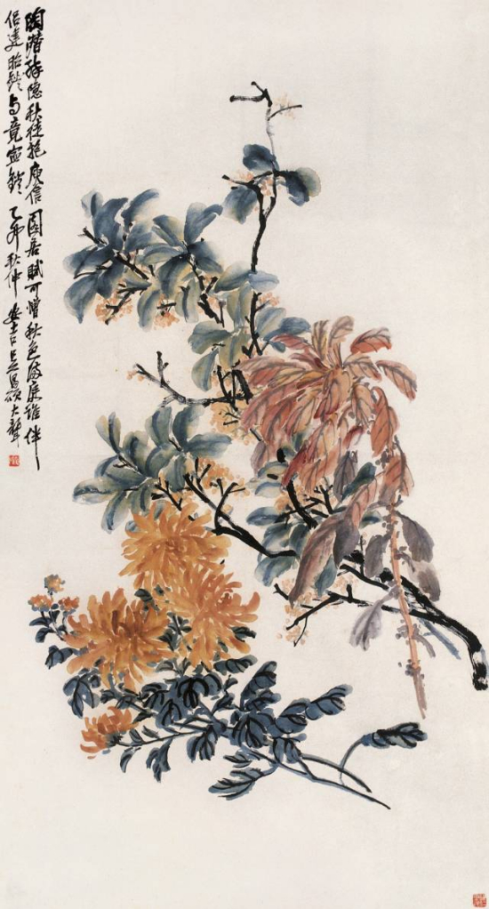编者按:“采菊东篱下,悠然见南山。”菊花,花中四君子之一,高风亮节,秀丽淡雅,亦有吉祥、长寿之意。历代画家皆喜用画笔来表现菊花的美好,书画频道特推出《秋风送爽 菊香阵阵》系列策划,请大家欣赏历代名家笔下的写意菊花。《秋风送爽 菊香阵阵》第一期,我们将继续辑录晚清民国时期艺术大师吴昌硕的菊花作品,令观者在大师独特的审美意境中,品菊花的逸气清香。