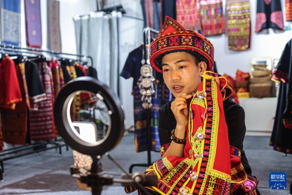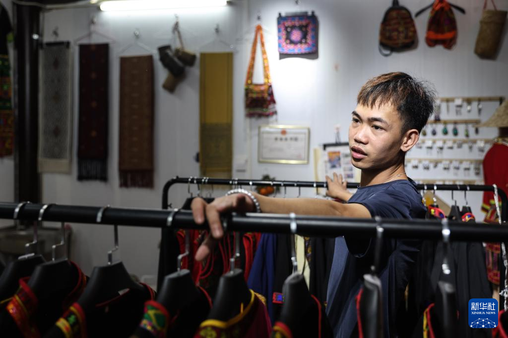从高中到大学,黄杨伟坚持学习黎锦技艺,制作了很多黎锦作品,还获了奖。渐渐地,家人开始认可“男人织黎锦”这件事。去年他和表姐一起在五指山市区开了一家黎锦服饰店,店名叫做“滴帕幔黎锦”。“滴帕幔”是黎语“未婚男性”的意思。除了卖黎族服饰,他还会不定期线上直播讲解黎锦制品和黎族文化。