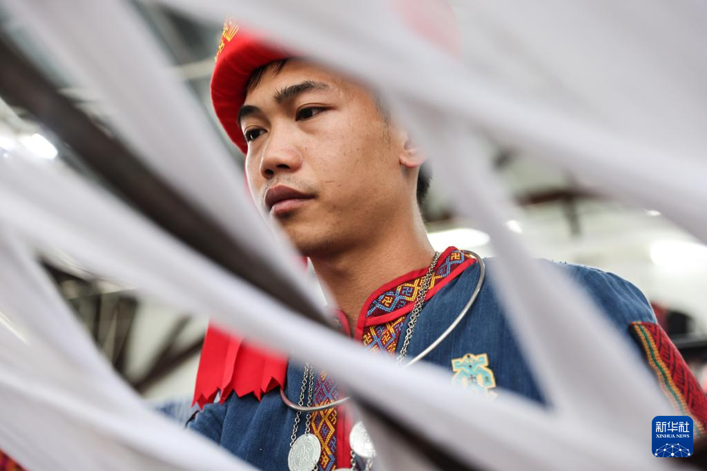 2月9日,黄杨伟展示自己的第一件黎锦作品。 新华社记者 张丽芸 摄