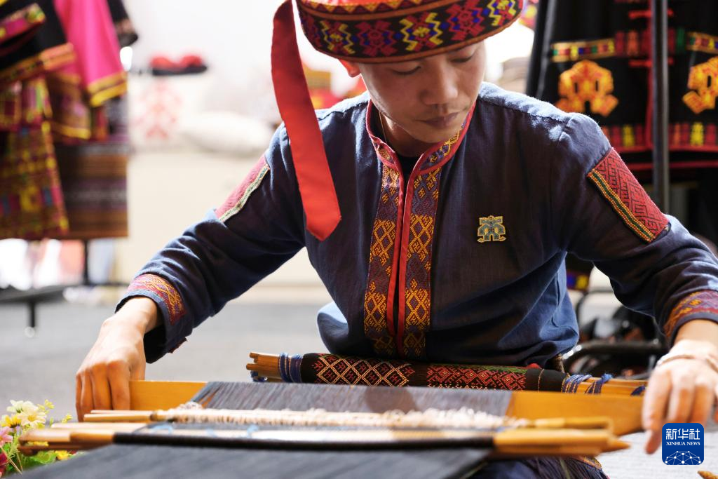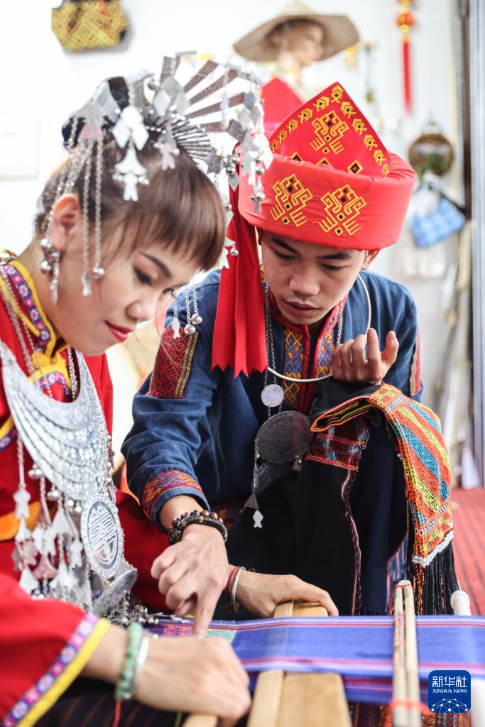2月8日,黄杨伟在自己的店里织黎锦。 新华社记者 张丽芸 摄