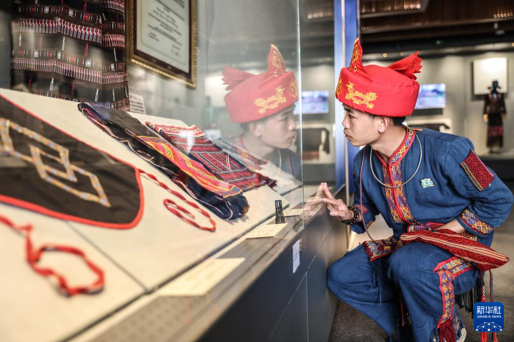 2月8日,黄杨伟在海南省民族博物馆里参观黎锦制品。 新华社记者 张丽芸 摄