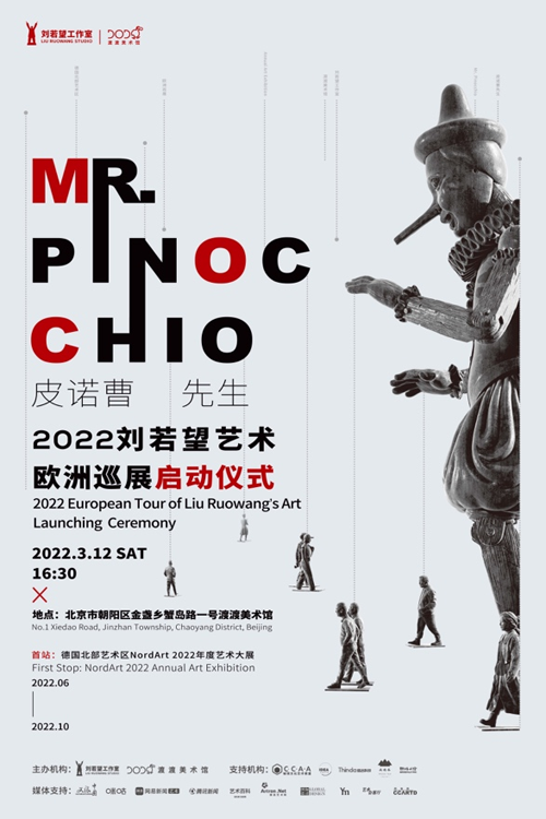 2022年3月12日下午,刘若望艺术2022欧洲巡展启动仪式在北京渡渡美术馆举行,新作《皮诺曹先生Mr.Pinocchio》组雕正式发布。这是这组作品首次以完整的形态呈现在公众面前,其创作灵感源自经典童话人物皮诺曹。启动仪式之后,“皮诺曹先生”将奔赴万里之外,开始它的欧洲巡游之旅。