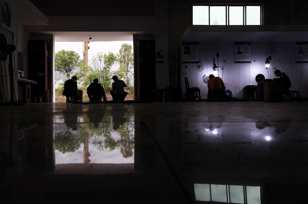 4月30日,在贵州省岑巩县思州石砚非遗传承基地,项目传承人周永平在检查思州石砚质量。