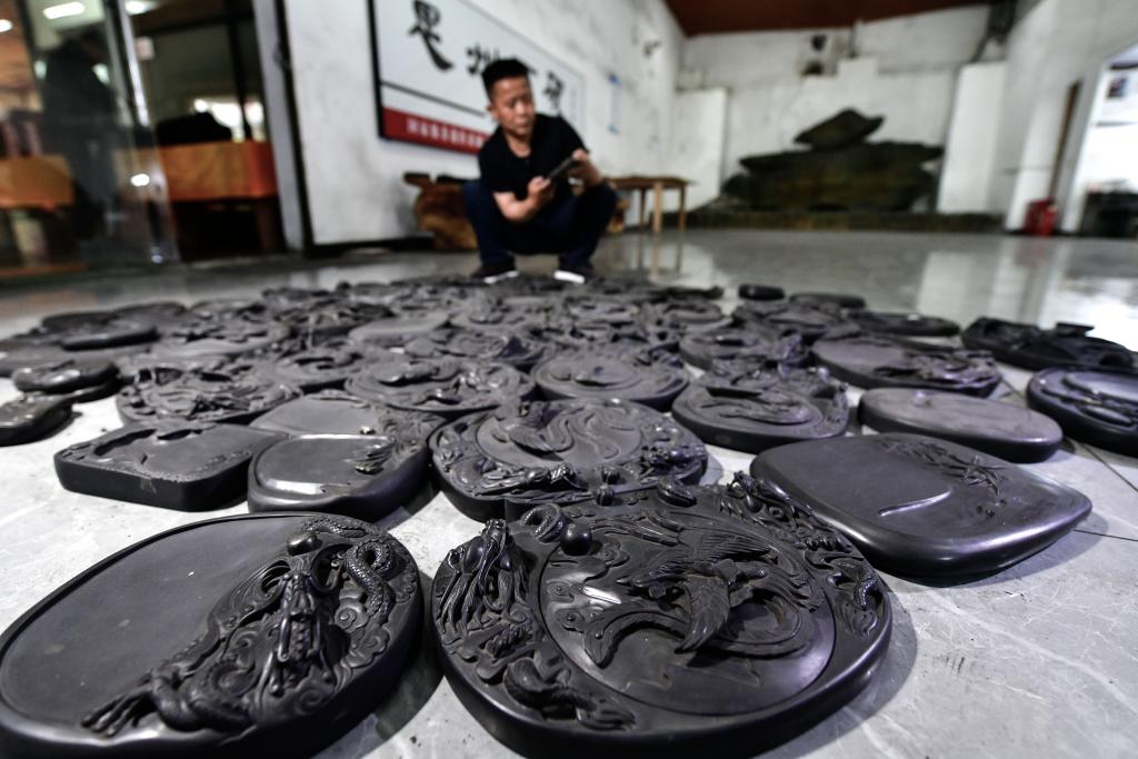 4月30日,在贵州省岑巩县思州石砚非遗传承基地,工匠在雕刻思州石砚。