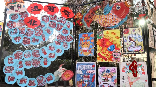 校园内一幅幅童真童趣的精美画作排列整齐,风格各异的金蛇形象在同学们的笔下活灵活现,作品还巧妙地将金蛇与鞭炮、福字、梅花等新年元素相结合,完美诠释了学生们对新年的美好祝福以及对未来生活的憧憬和向往。
