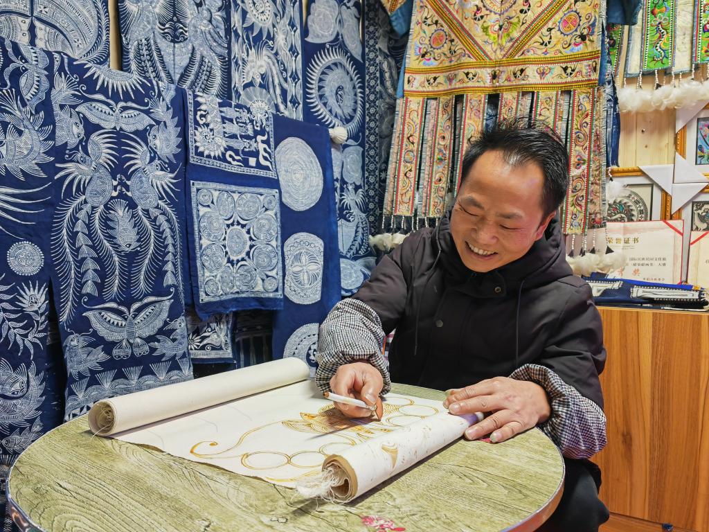 如今,在黔东南州凯里市苗侗风情园“非遗集市”一间10余平方米的店铺里,他制作的蜡染作品被巧妙加工成衣服、包包、杯垫等产品,深受顾客喜爱。2024年,他的店铺销售额达15万元。