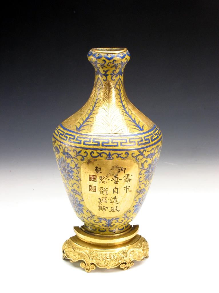展览中,外形略似蒜头瓶的清乾隆御制诗掐丝珐琅蕉叶开光挂瓶是清宫原藏中悬挂于御用车轿内的佳器。鎏金开光处内制黑色“御制”二字,其下为于敏中手书乾隆帝御制诗文,使其兼备抒情文采。