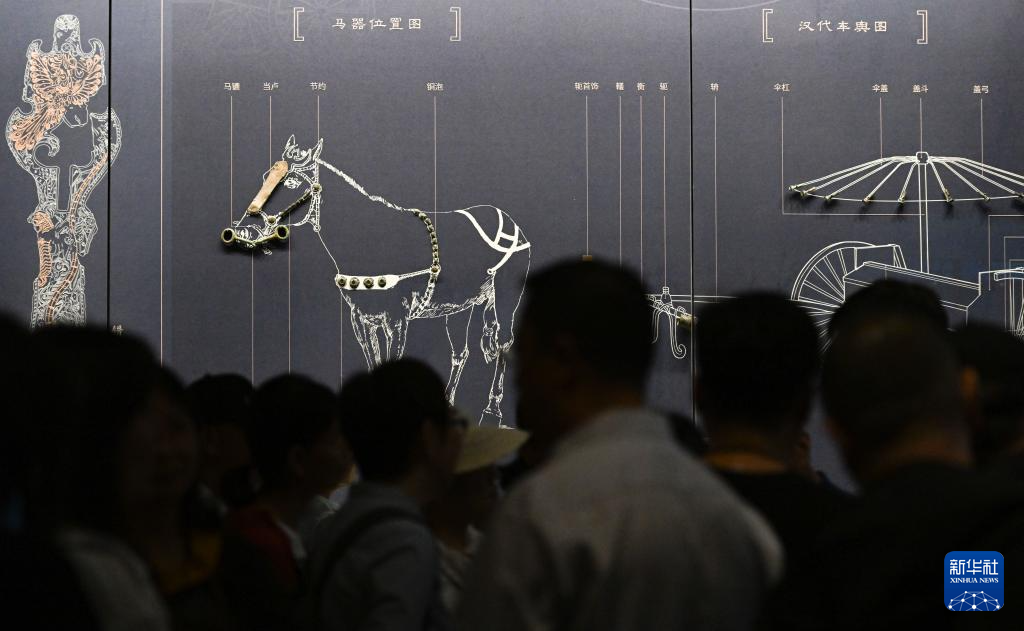 5月20日,观众在一号墓展区观看介绍汉代车马构造的展板。