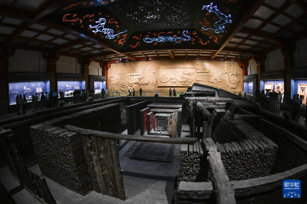 一号墓展区完整展示了汉代“梓宫、便房、黄肠题凑”(由后至前)葬制(5月20日摄)。