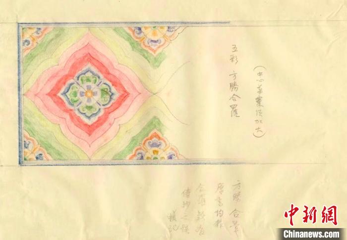 5月27日,“彩画千年——中国官式彩画传承与创新展”在故宫博物院永寿宫展厅正式对公众开放。图为梁思成手绘的宋代五彩方胜合罗(复制品)。(故宫博物院供图)