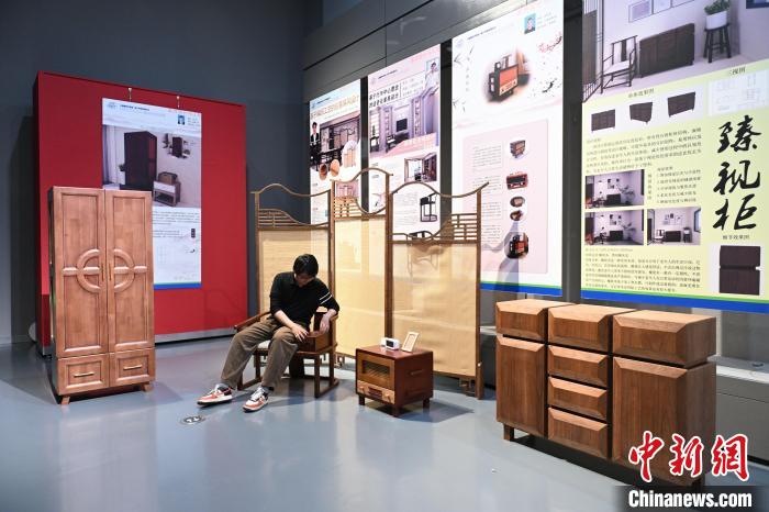 5月29日,内蒙古呼和浩特市,观众体验大学生设计的新中式家具。