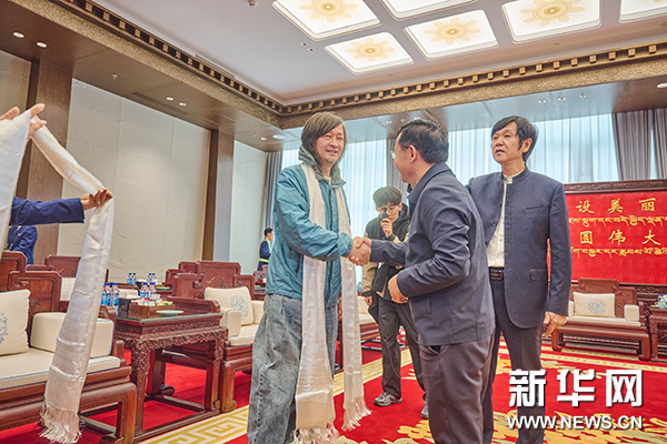 图为西藏自治区党委宣传部副部长、文化和旅游厅党组书记肖传江向艺术家们敬献哈达