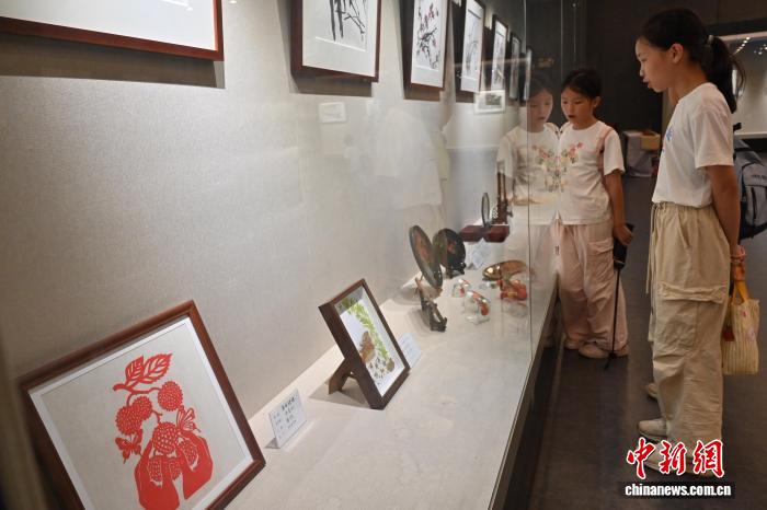 7月19日,“七月荔枝红”主题书画展展出的荔枝手工艺作品吸引参观者。近日,该展览在广州市广州图书馆展出,以岭南荔枝为主题,展现广州白云区乡村振兴与岭南文化魅力。中新社记者 陈楚红 摄
