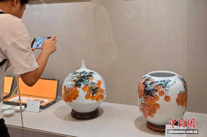 7月19日,“七月荔枝红”主题书画展展出的釉上五彩作品《大荔图》吸引参观者。近日,该展览在广州市广州图书馆展出,以岭南荔枝为主题,展现广州白云区乡村振兴与岭南文化魅力。中新社记者 陈楚红 摄
