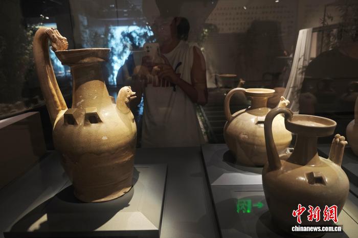 7月30日,江苏南京,观众在六朝博物馆内参观展陈的青瓷双龙柄鸡首壶(左)等文物。正值暑期,南京文博场馆迎来参观热潮。中新社记者 泱波 摄