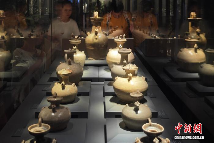 7月30日,江苏南京,观众在六朝博物馆内参观展陈的青瓷鸡首盘口壶(左一)、黑釉鸡彩壶等文物。正值暑期,南京文博场馆迎来参观热潮。中新社记者 泱波 摄