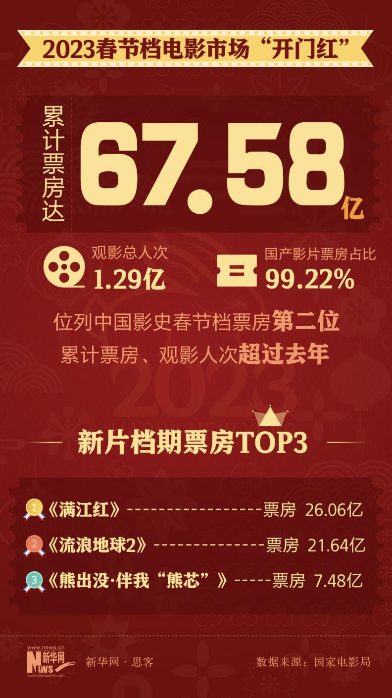 据国家电影局初步统计:2023年春节档(1月21日至27日)电影票房为67.58亿元,仅次于2021年春节档的78.42亿元,位居中国影史同期票房第二名。影院的春天回来了,电影行业的希望也回归了。