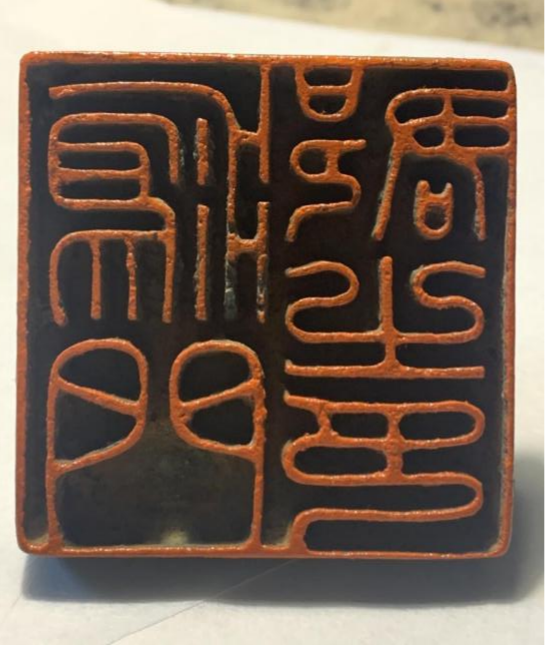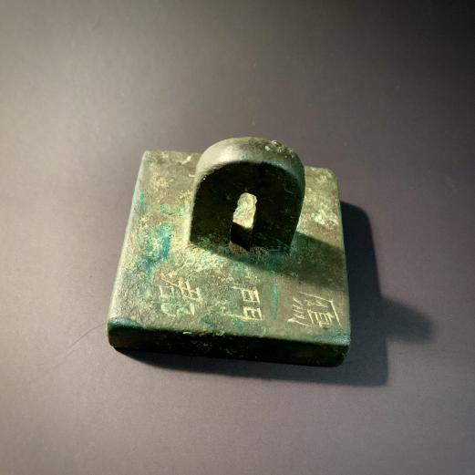 我们仔细观察这方印的鼻钮会发现,鼻钮的绳口隐隐约约能看出有磨损的痕迹。这说明鼻钮不仅是方便盖印时把握力度,同时可以看出,当时的官吏为了使用和携带方便,确实是用绳子拴系着鼻钮的,类似当今时髦女孩的手机链。用放大镜还可以看到鼻钮绳孔内侧,沉淀着微量的泥沙,已经和锈斑锈蚀融合在一起了。