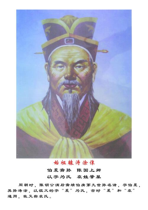 周时,陈国始君胡公满(妫满)的十一世孙诸,字伯爰,其孙辕涛涂(也称袁涛涂、爰涛涂),从齐桓公盟会,赐邑阳夏(今河南省太康),以祖父的字为姓(因古时爰、袁、辕相通),称为袁氏。其后裔以“袁”为姓,袁涛涂被尊为袁姓始祖。现在河南太康仍保留有涛涂墓和袁氏宗庙。