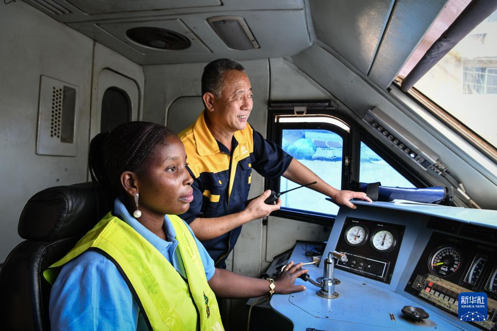 3月2日,在尼日利亚拉各斯的拉伊铁路莫博拉吉·约翰逊火车站,中方指导司机魏汝军与当地司机塞拉·阿比亚拉在驾驶室调整车辆,准备发车前往伊巴丹。