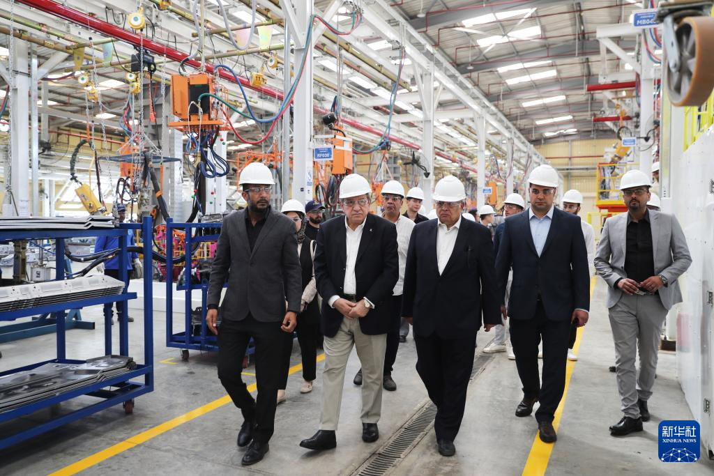 埃及前总理埃萨姆·谢拉夫(前排左二)参观位于埃及十月六日城的捷途埃及焊装工厂(6月18日摄)。新华社记者 隋先凯 摄