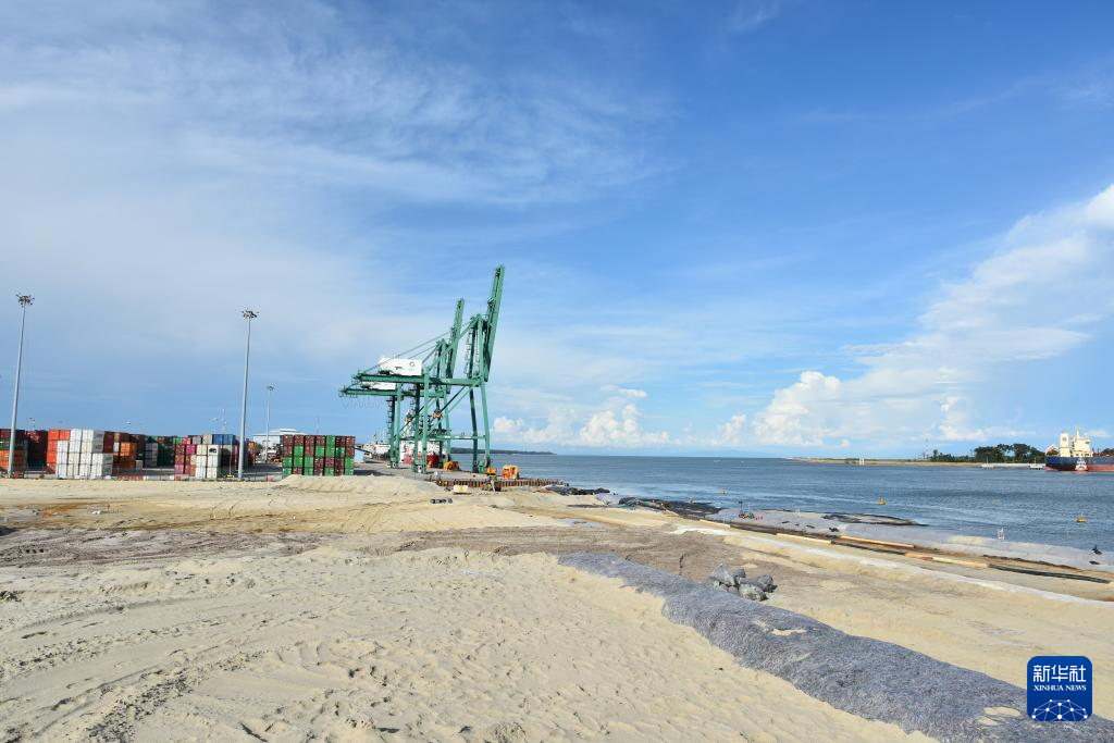 记者8日在施工现场看到,码头吹填区域新海岸线已初具雏形,各类机械装备正紧张有序地作业。巨大塔吊和层层叠叠的集装箱货柜与宽广碧蓝的海面相映衬,货轮在牵引船的引导下慢慢驶近。