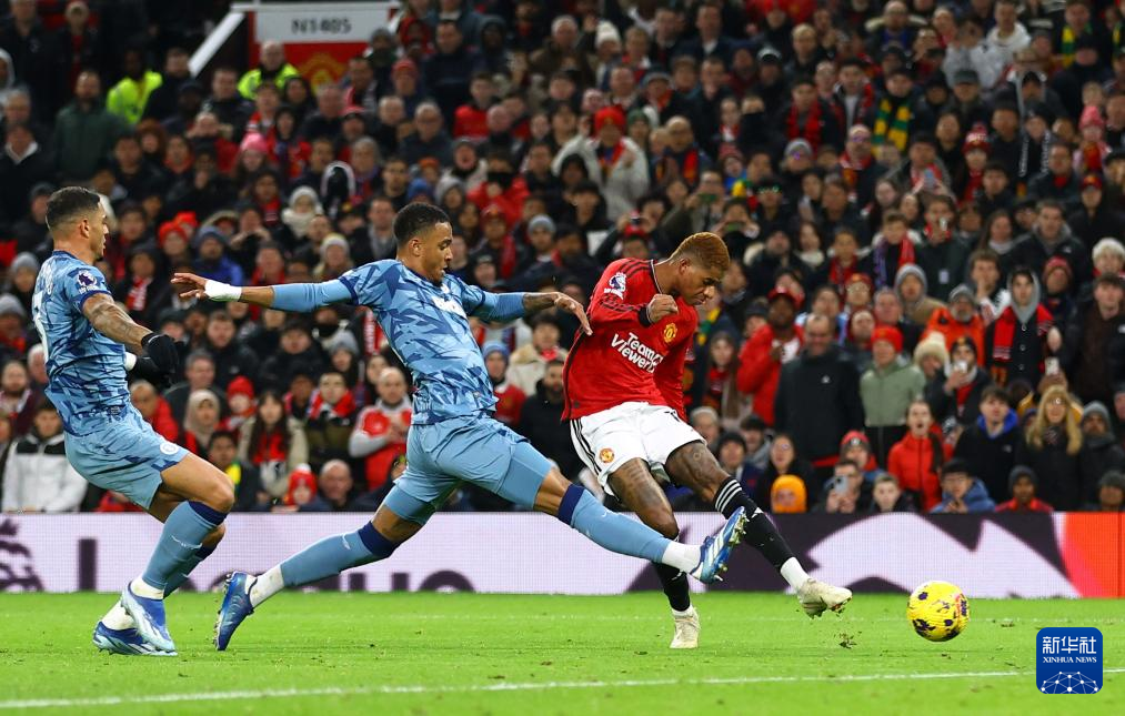 12月26日,曼联队球员加纳乔(右一)在比赛中射门得分。新华社/路透