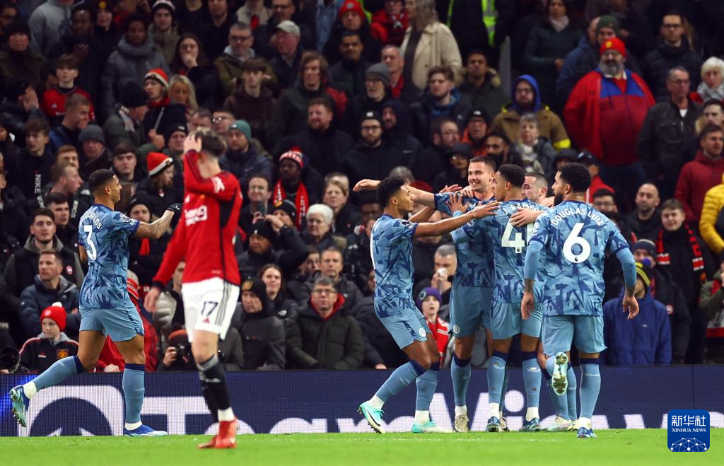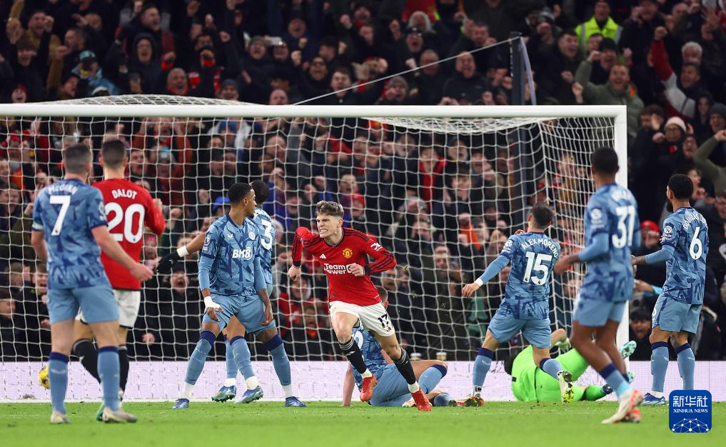 12月26日,曼联队球员加纳乔(中)在比赛中庆祝进球。新华社/路透