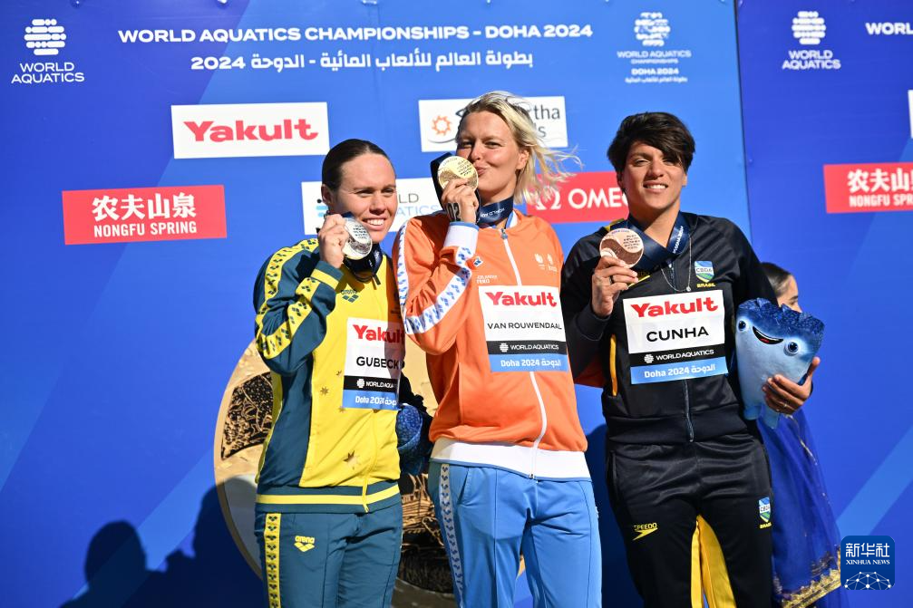 2月7日,冠军荷兰选手范洛文达尔(中)、亚军澳大利亚选手切尔西·吉尔贝卡(左)和季军巴西选手安娜·马塞拉·库尼亚在颁奖仪式上合影。新华社记者 薛宇舸 摄
