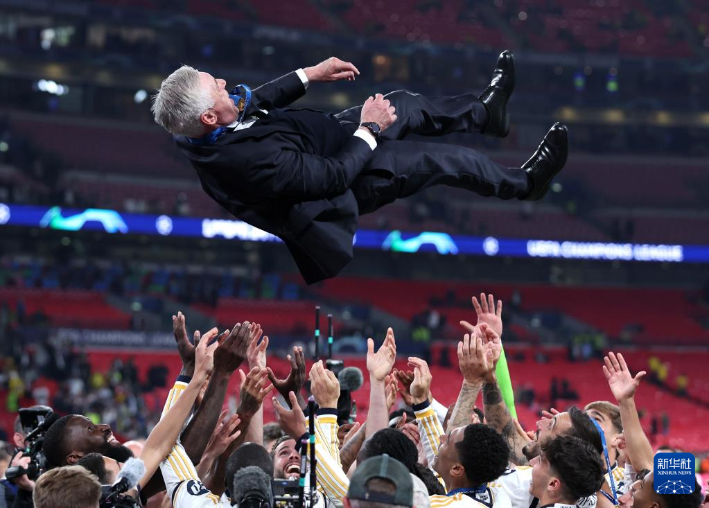 6月1日,皇家马德里队主教练安切洛蒂捧杯庆祝。新华社发