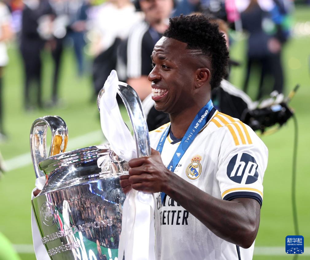 6月1日,皇家马德里队球员维尼修斯捧杯庆祝。新华社发