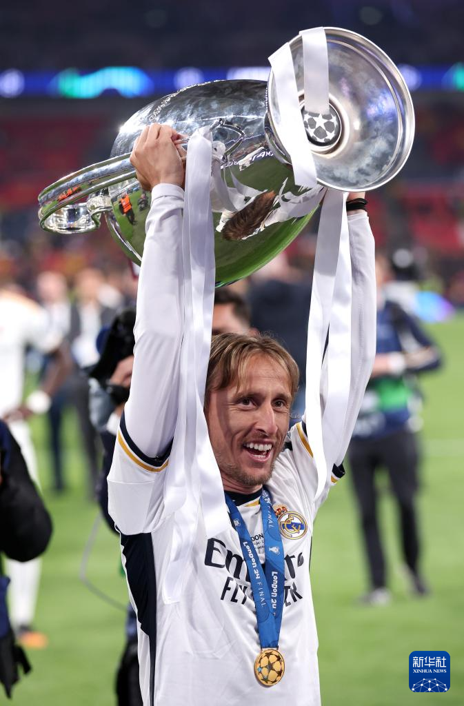 6月1日,皇家马德里队球员莫德里奇捧杯庆祝。新华社发
