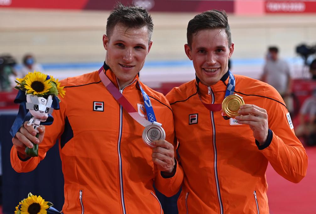 2021年8月6日,荷兰选手拉弗雷森(右)和队友霍赫兰德在颁奖仪式上。当日,在东京奥运会场地自行车项目男子争先赛中,荷兰选手拉弗雷森和霍赫兰德包揽冠亚军。新华社记者 贺长山 摄
