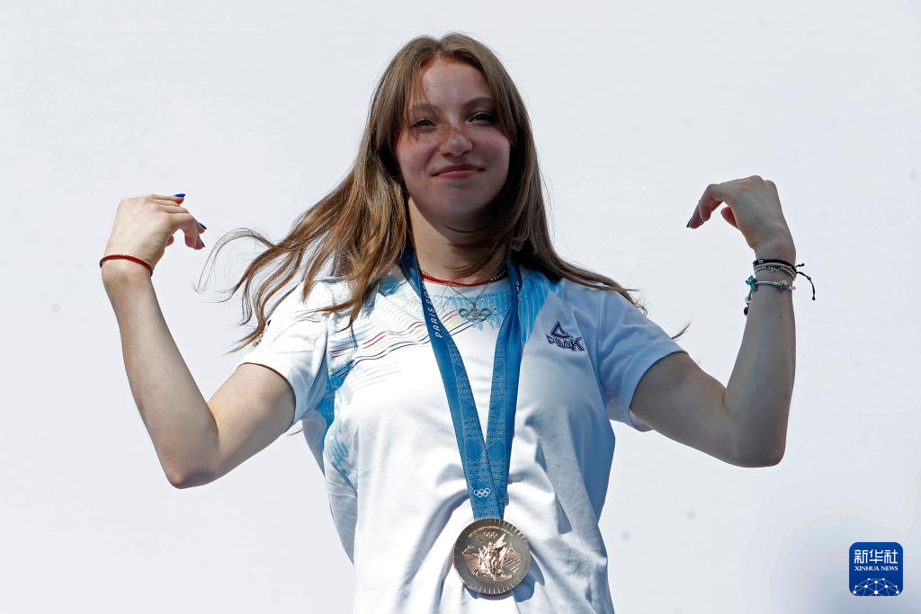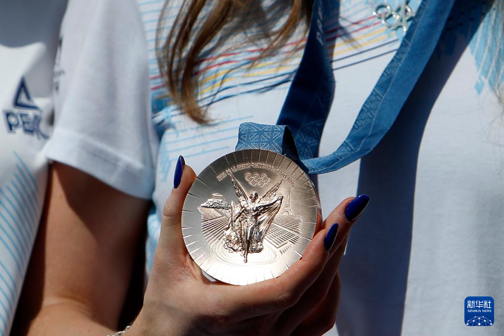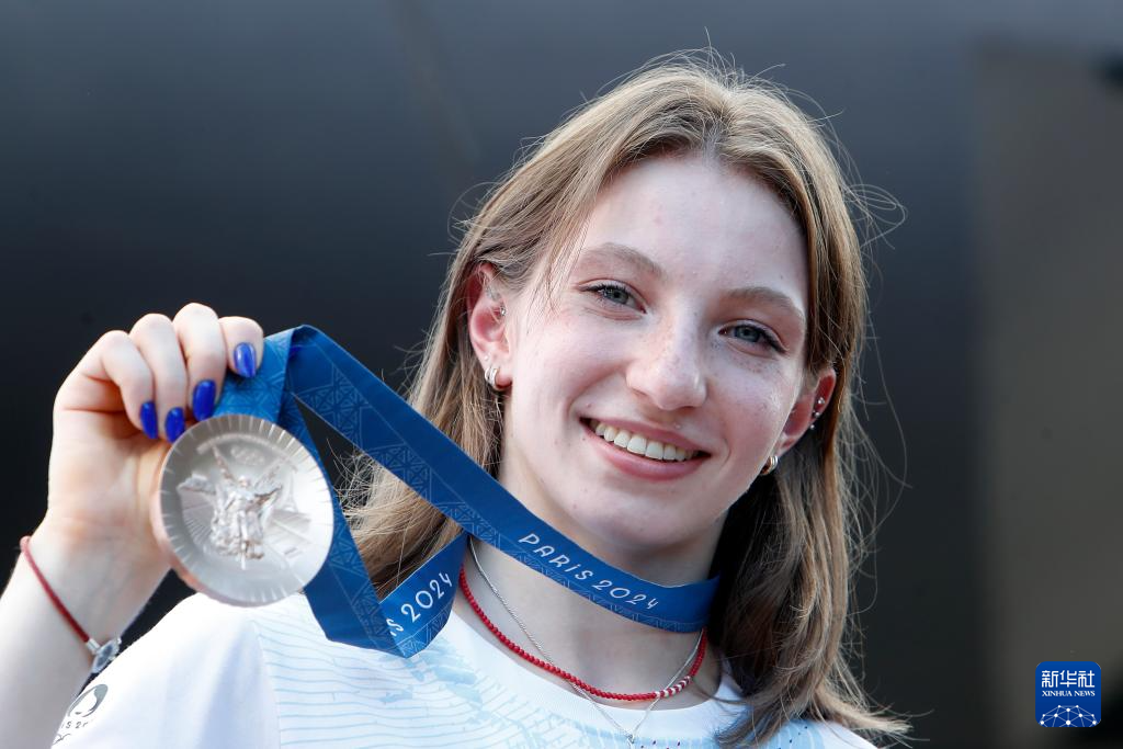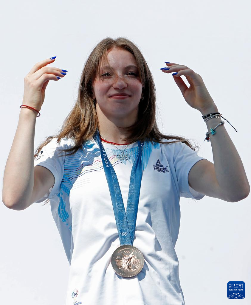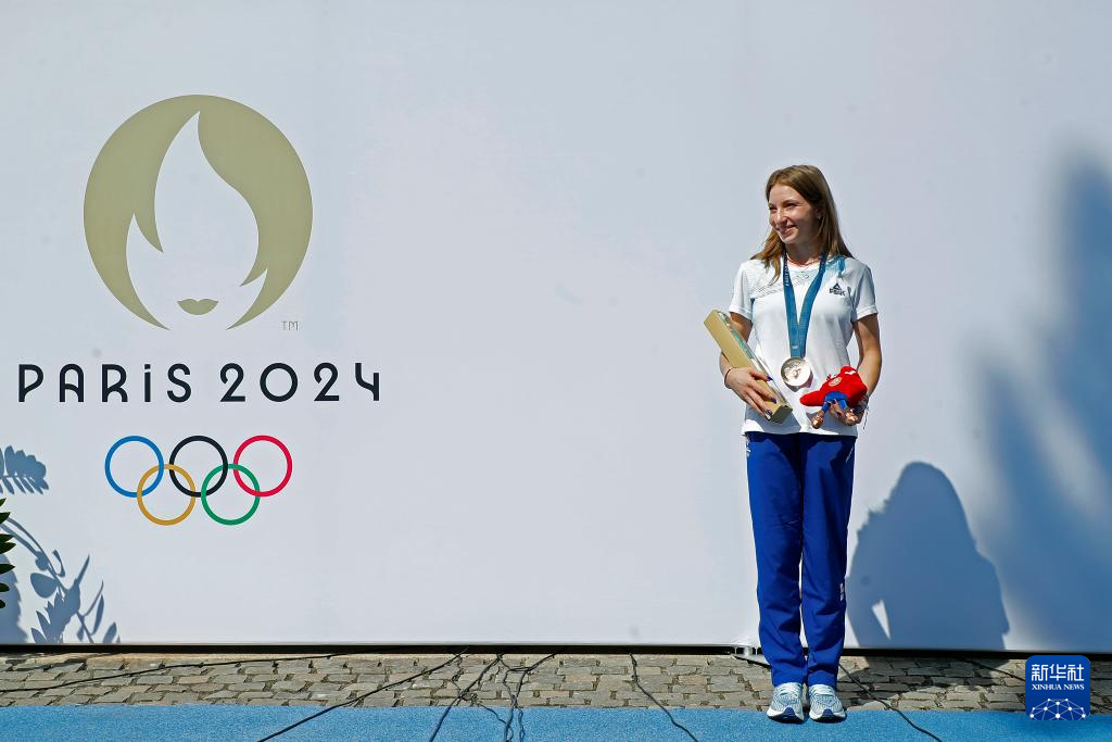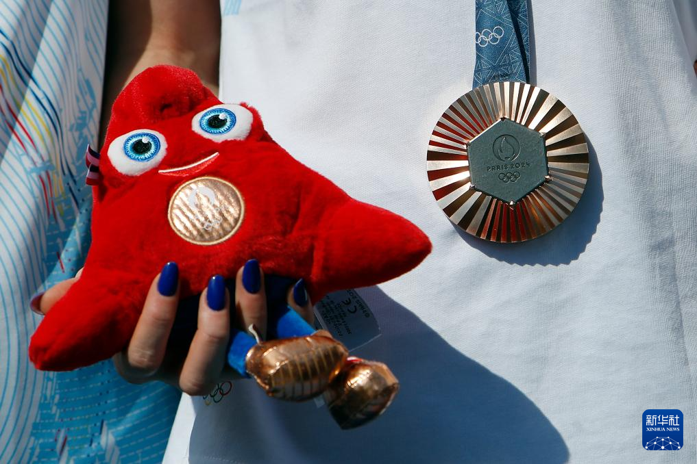 8月16日,罗马尼亚选手安娜·伯尔博苏在颁奖仪式上与奖牌和巴黎奥运会吉祥物合影。