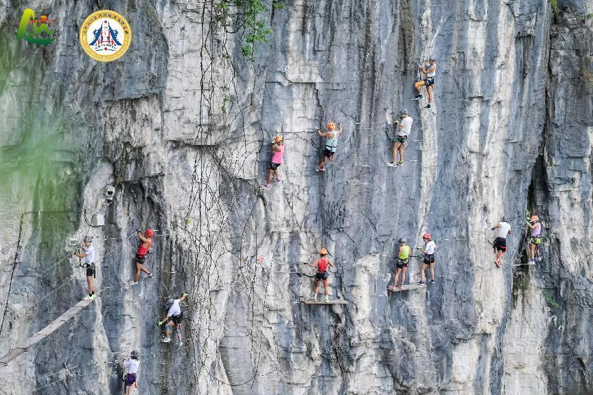 此次竞赛项目分为两个组别, A组“高空铁三”竞赛由16公里越野跑和“高空铁三”组成,B组趣味“高空铁三”竞赛由打绳结、冰壶、木射和“高空铁三”组成。其中,两个组别均覆盖的“高空铁三”包含了矮寨奇观景区所独有的云中漫步、高桥矩阵和飞拉达等三个项目。