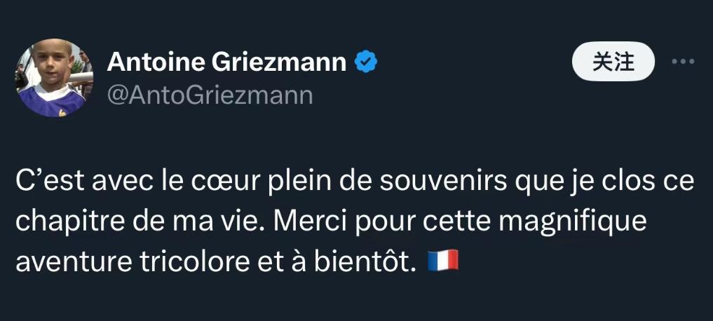“我怀着满满的回忆结束人生的这一章节。感谢这段美妙的国家队生涯。相信我们很快会再见。”格列兹曼在社交账号上发布了退役声明。