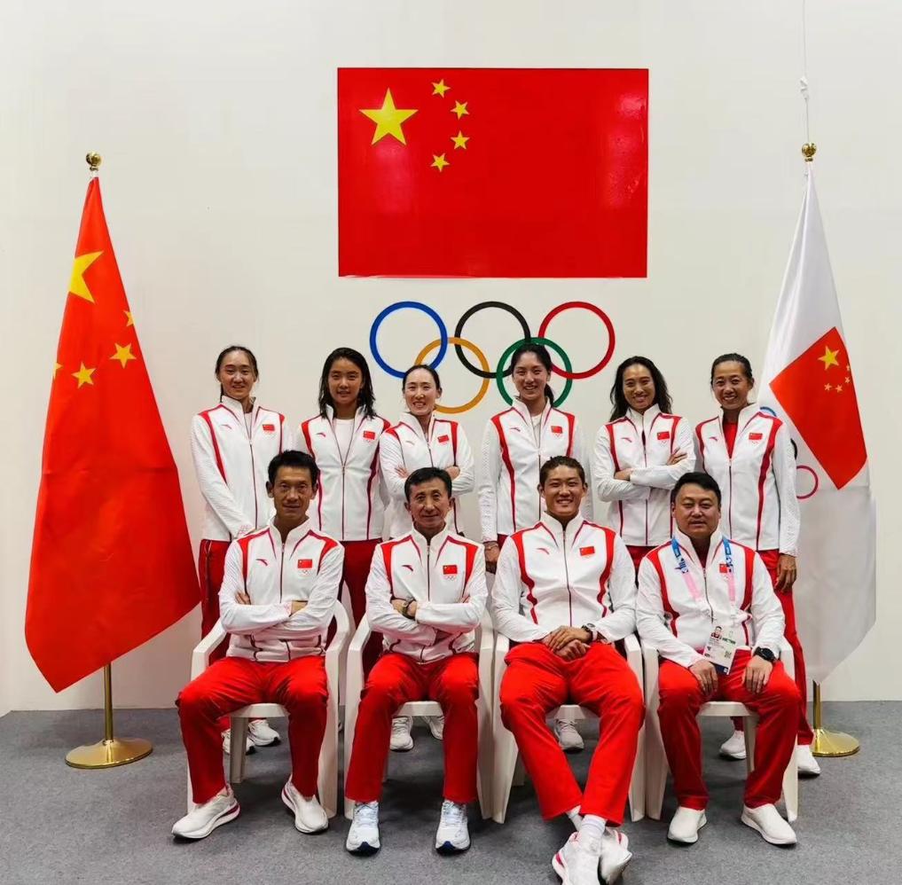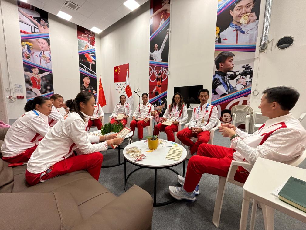7月24日,白喜林(右一)在巴黎奥运会运动员村与国家网球队成员交流。