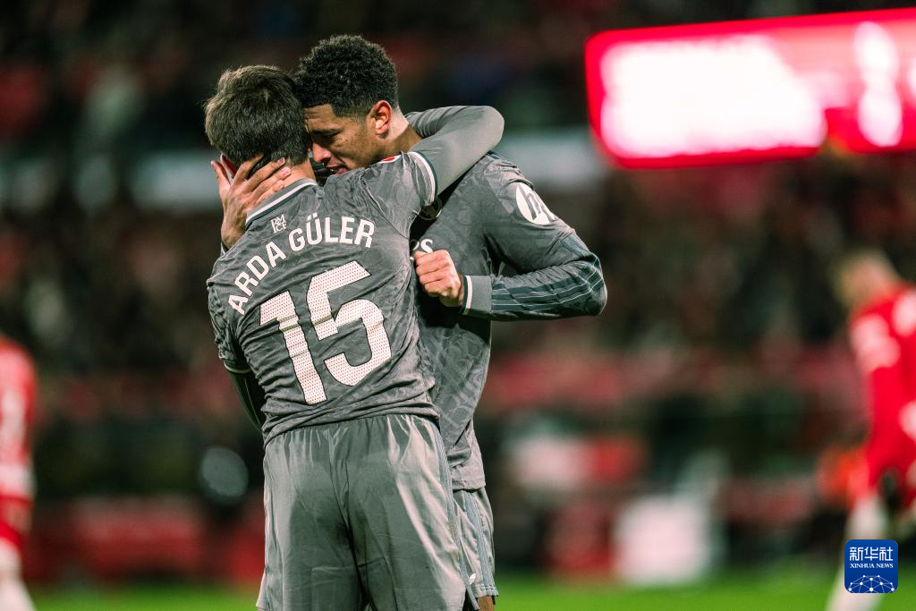 12月7日,皇家马德里队球员贝林厄姆(右)与队友居莱尔庆祝进球。