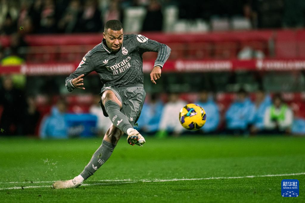 12月7日,皇家马德里队球员姆巴佩在比赛中射门。