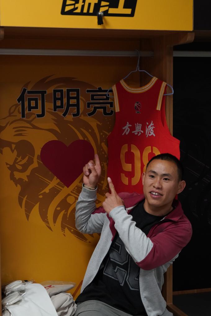 在球队更衣室里,何明亮与胡金秋、孙铭徽、赵岩昊等新队友握手后,一脸满足地坐在他的专属更衣柜前,展示着自己的球衣。随后他穿上队服,加入球队的赛前动员中,准备迎接他的首次CBA热身训练。
