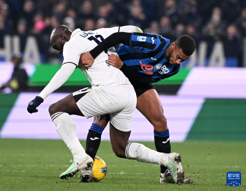 1月18日,那不勒斯队球员卢卡库(左)与亚特兰大队球员希恩在比赛中拼抢。