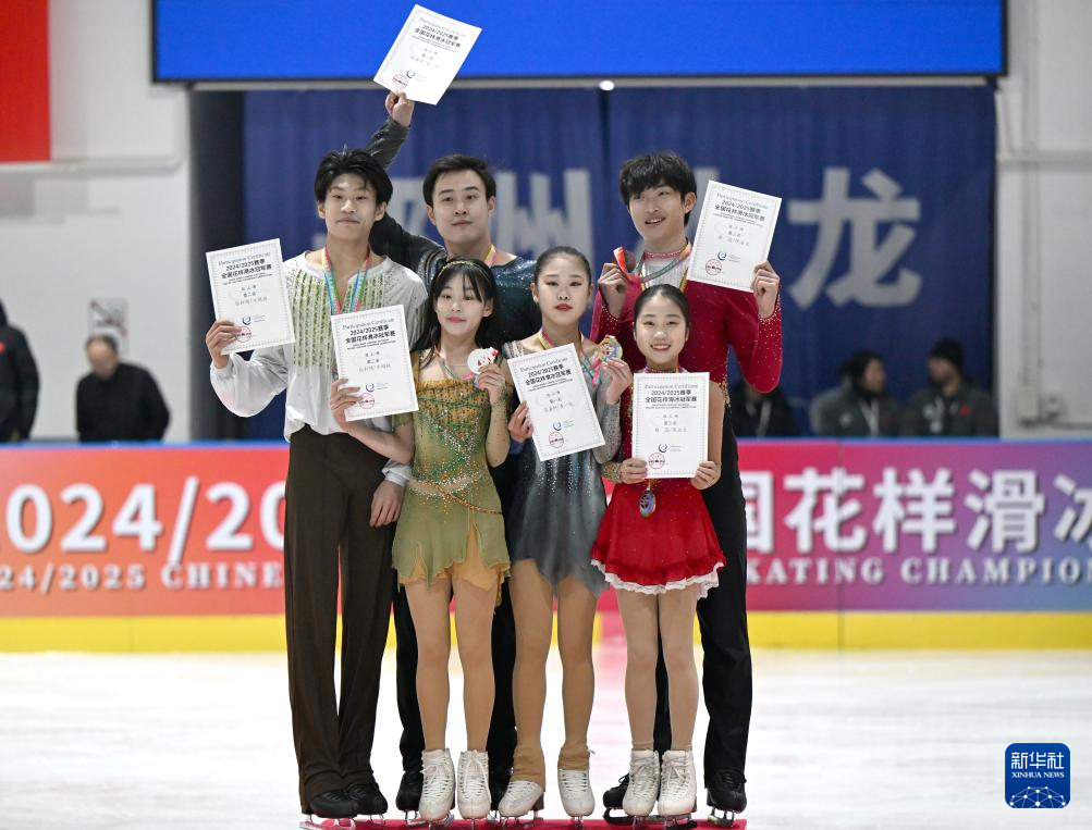 1月19日,冠军张嘉轩(前中)/黄一航(后中)、亚军张轩绮(前左)/丰闻强(后左)、季军郭蕊(前右)/张益文在双人滑颁奖仪式上。