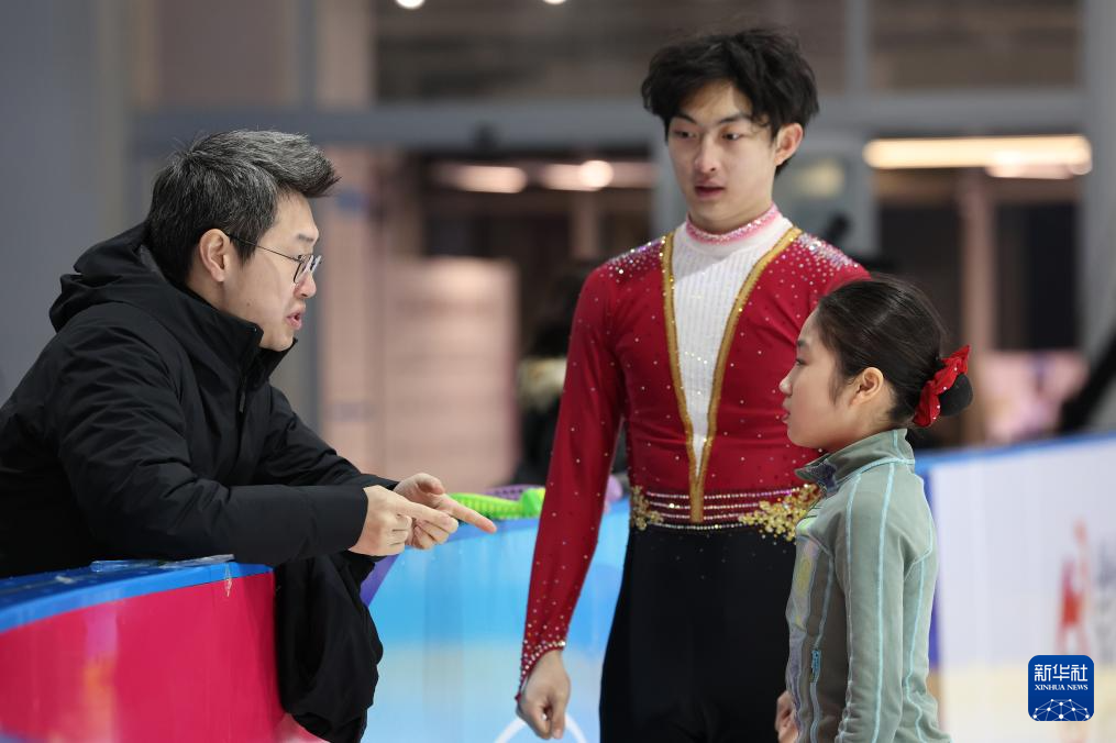 1月19日,齐齐哈尔市冬季运动项目中心(齐齐哈尔市滑冰学校)组合郭蕊(右)/张益文(中)在热身环节听取教练员关金林指导。最终,他们获得双人滑季军。