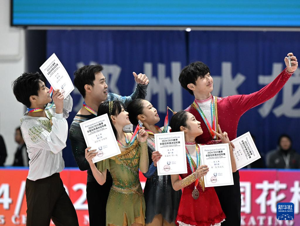 1月19日,冠军张嘉轩(右三)/黄一航(左二)、亚军张轩绮(左三)/丰闻强(左一)、季军郭蕊(右二)/张益文在双人滑颁奖仪式上自拍合影。