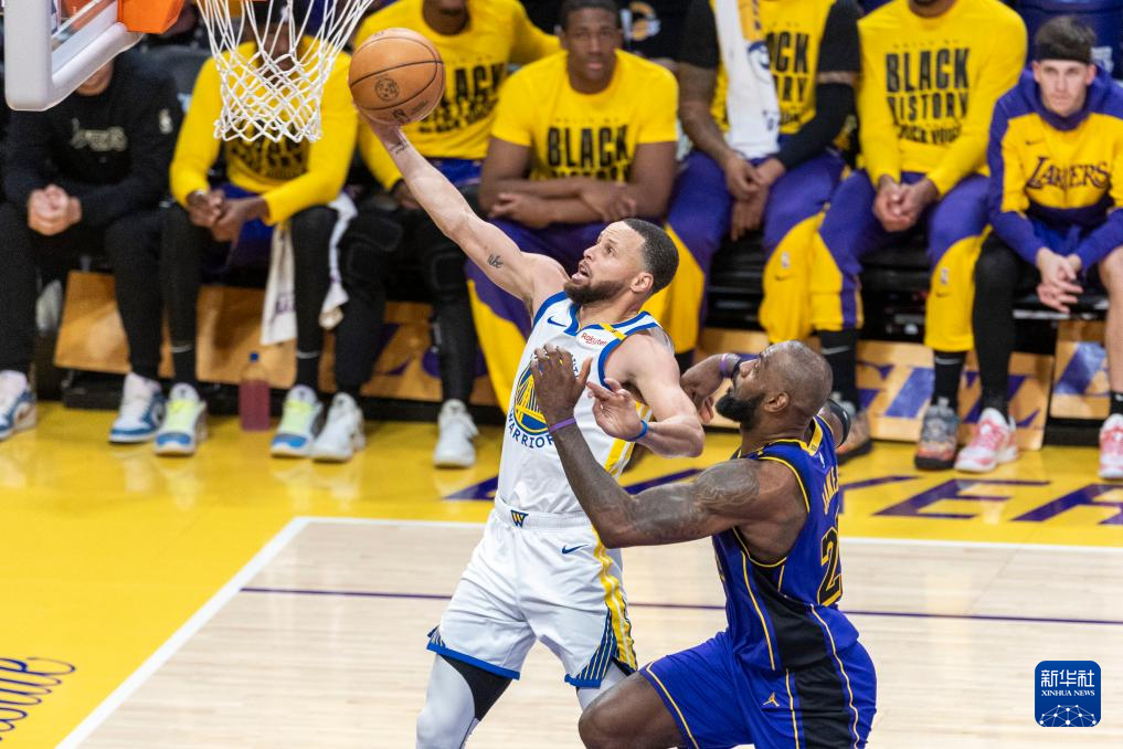 2月6日,勇士队球员斯蒂芬·库里(左) 在湖人队球员勒布朗·詹姆斯防守下上篮。