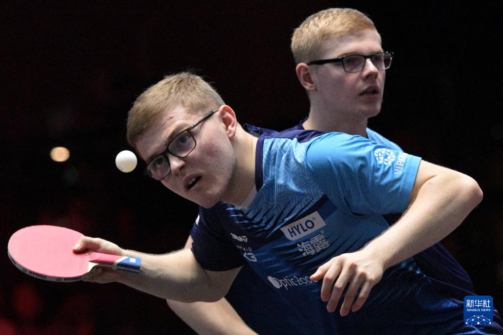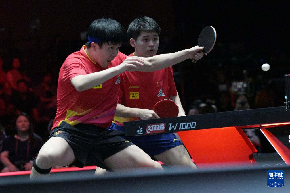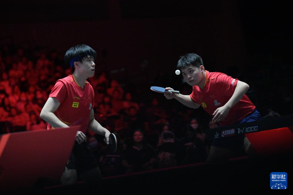 2月7日,中国组合王楚钦/林诗栋(右)在比赛中回球。
